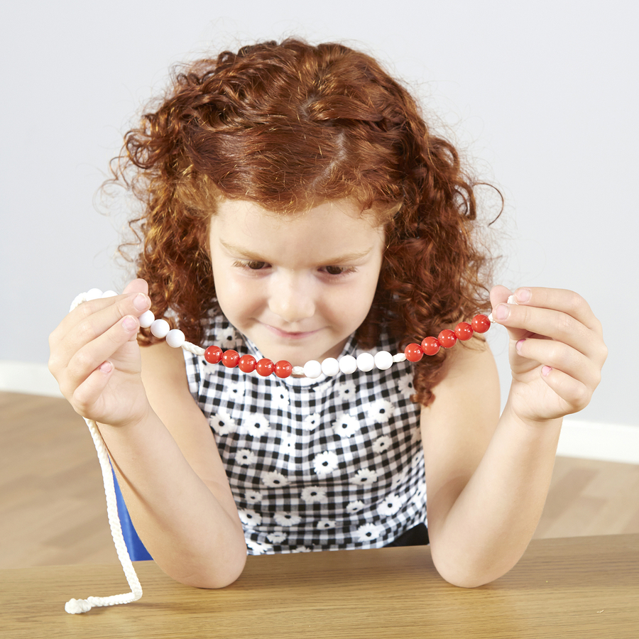 It visually assists in teaching 'more than' and 'less than', engaging children in learning by featuring 20 alternating red and white beads.