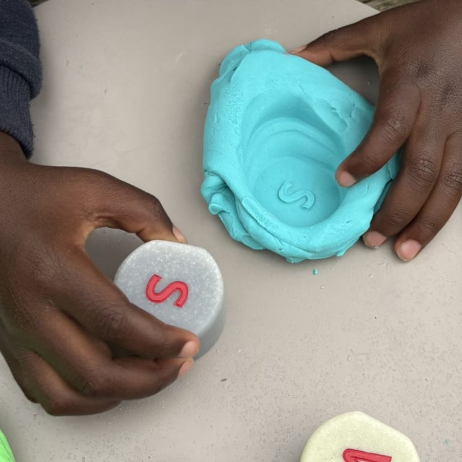 The stampers support phonics teaching methods, aiding in letter-sound correspondence. This aligns with the UK curriculum's focus on foundational literacy skills through hands-on activities.