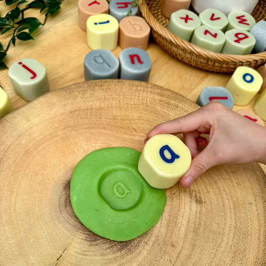 Each stamper has an engraved and painted letter on top and a recessed letter underneath. This dual design aids stamping activities, engaging children with literacy tasks.
