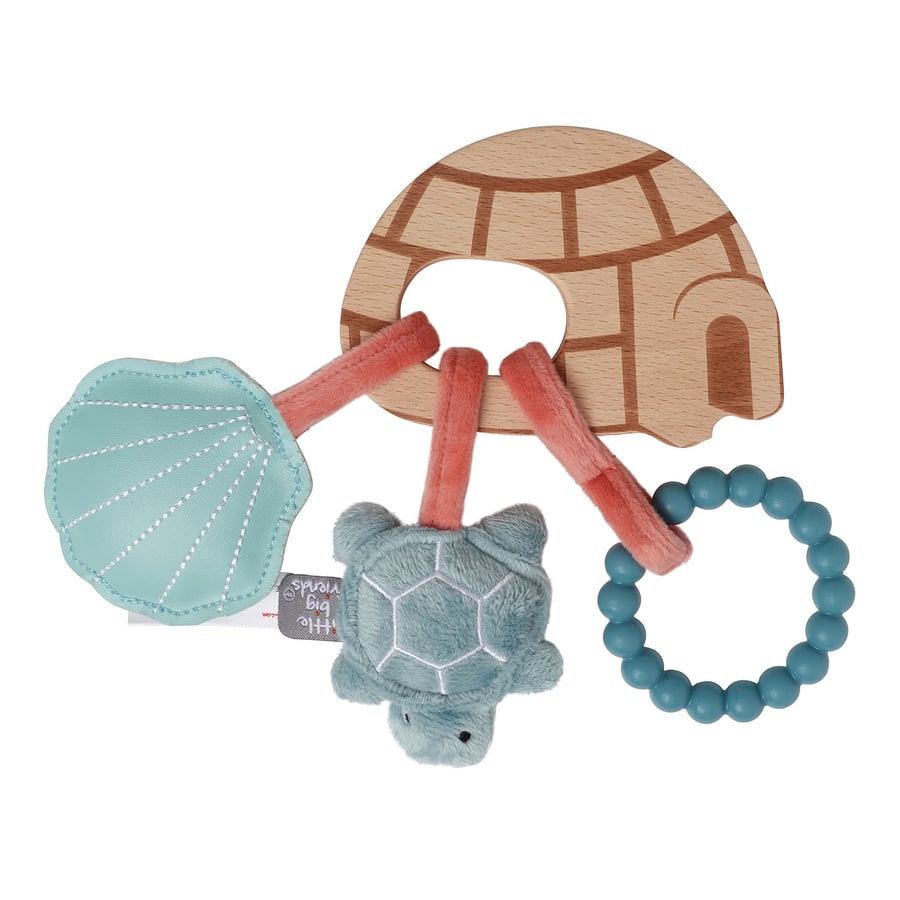 The ocean themed bundle includes the Reversible Playmat, Wooden Activity Gym, Wooden Rattle & Teether, Activity Spiral, Activity Cube, Activity Book, Roly Poly Balls 4pk, Musical Turtle Friend, Musical Penguin Friend, Baby Rattle Octopus and Rattle Whale.