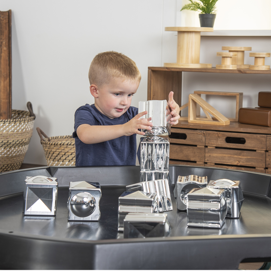 Some children love exploring the Distorting Mirror Construction Cubes . They are fascinated by the upside-down world they present from some of the surfaces (concaved sides). Others are entranced by the varying reflections in the other surfaces of the cube, each one mirroring awe and wonder in their eyes. For the older children, this can lead to interesting conversations about difference and perception.