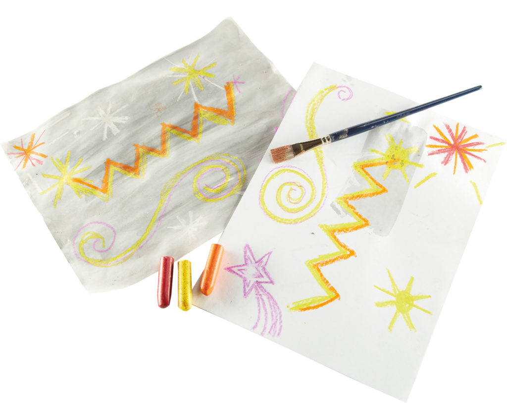 Create colourful wax resist firework pictures using a wash of watered down ready mix black paint over your wax crayon firework designs. The wax will repel the paint with your night sky patterns revealed.