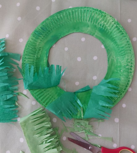 Cut lengths of light and dark green tissue paper. ‘Snip’ into one side of the tissue strips to create a textured grass effect. Wrap the pieces of tissue lightly around the wreath securing each piece on the back with clear tape.