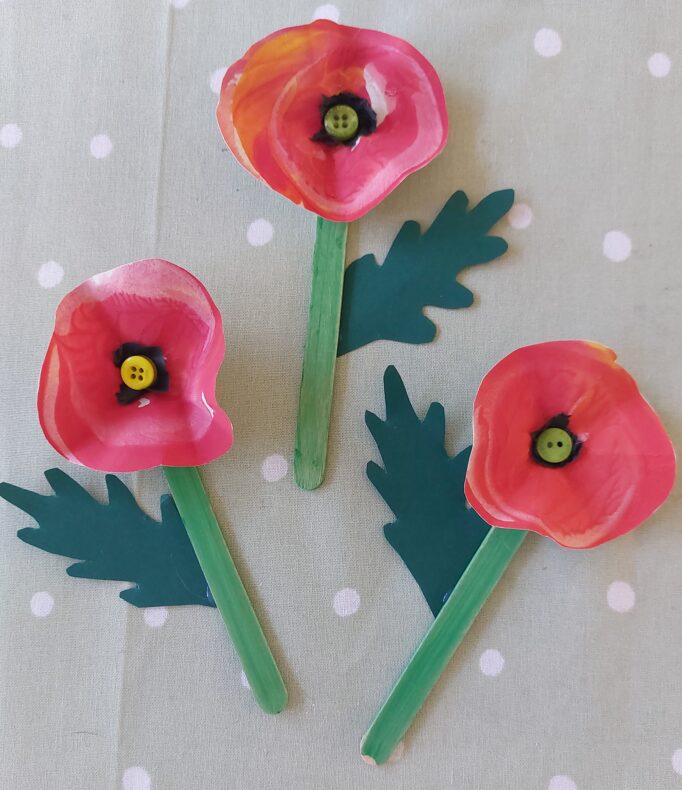 Print and make some 3D poppy flower shapes using ready mixed paint onto cartridge paper following the same instructions in our blog ‘Remembrance Poppy Wreath’.