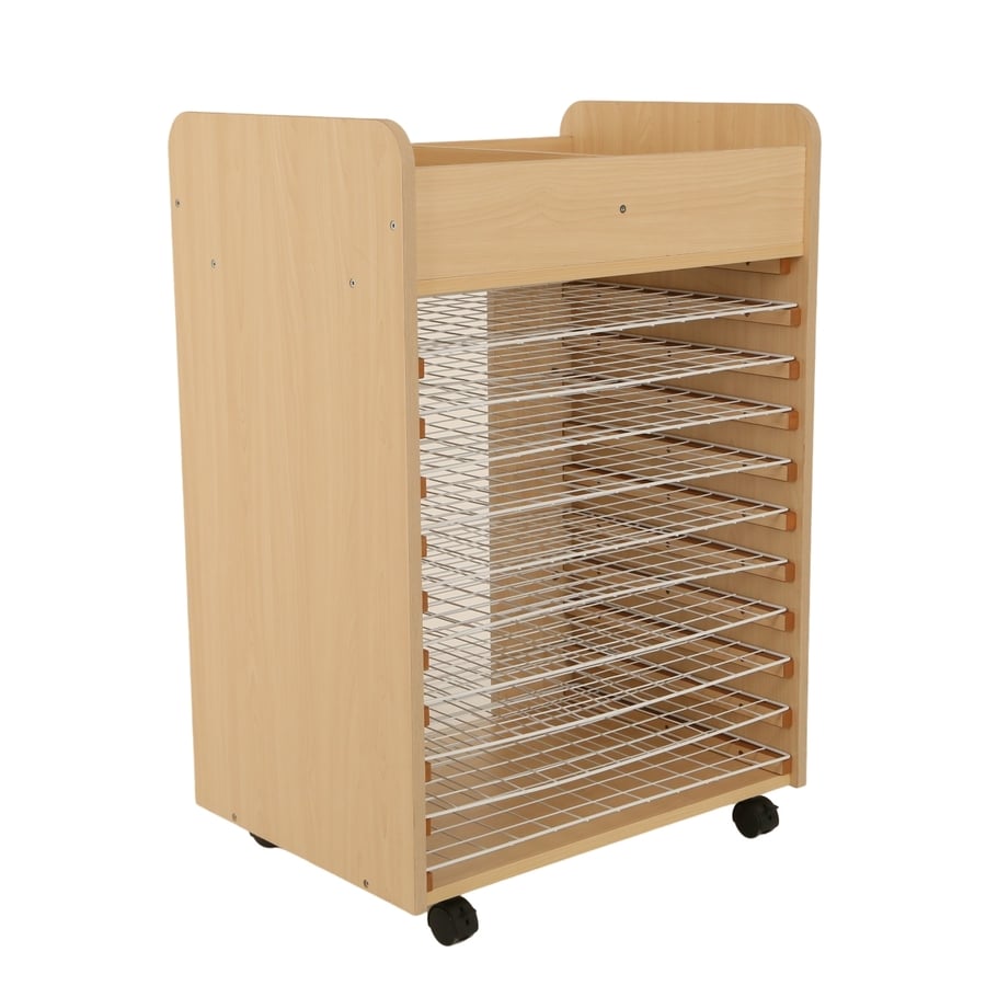 10 removeable racks to fit A3 artwork with storage on top for creative resources and supplies.