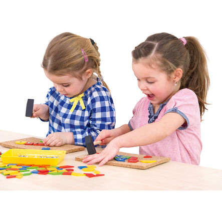 • This set lets children hammer wooden pieces into cork boards, improving their fine motor skills and creativity.
