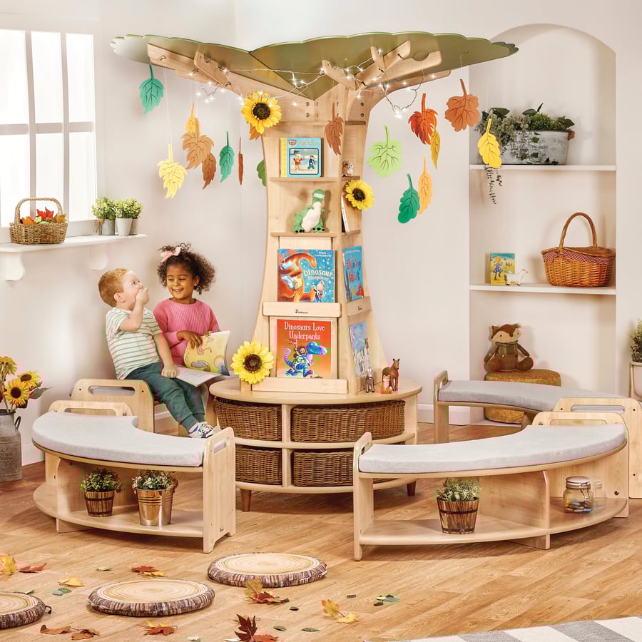 The storytelling tree includes eight corner baskets in its base, ideal for storing resources. This feature supports organisational skills and keeps the reading area clutter-free.