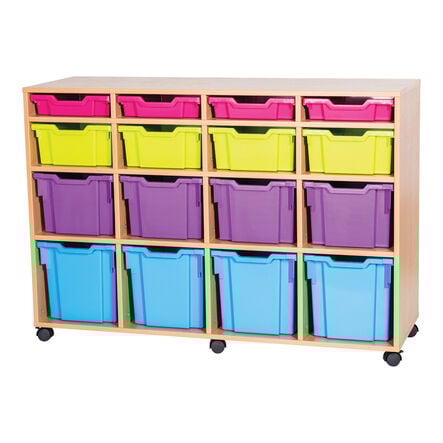 The unit fits 4 each of Gratnells shallow, deep, extra deep, and jumbo trays, offering versatile storage options for various classroom materials.