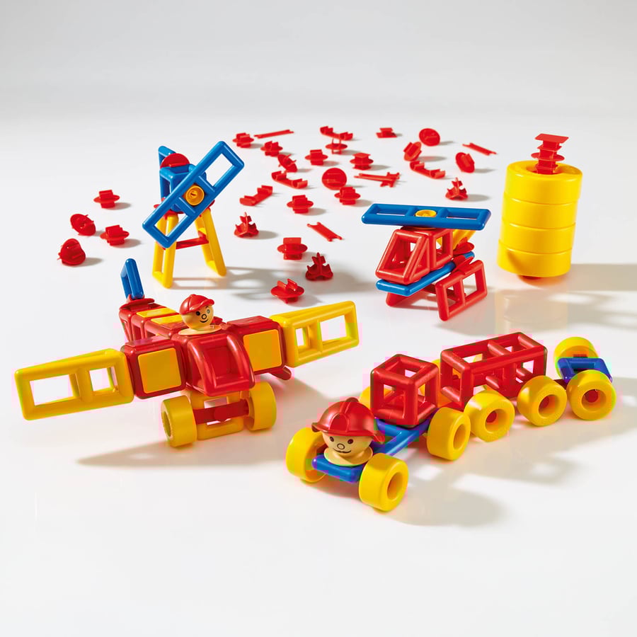 The construction activities offered by this set help develop and refine children's small motor skills through tasks like threading and small world play.
