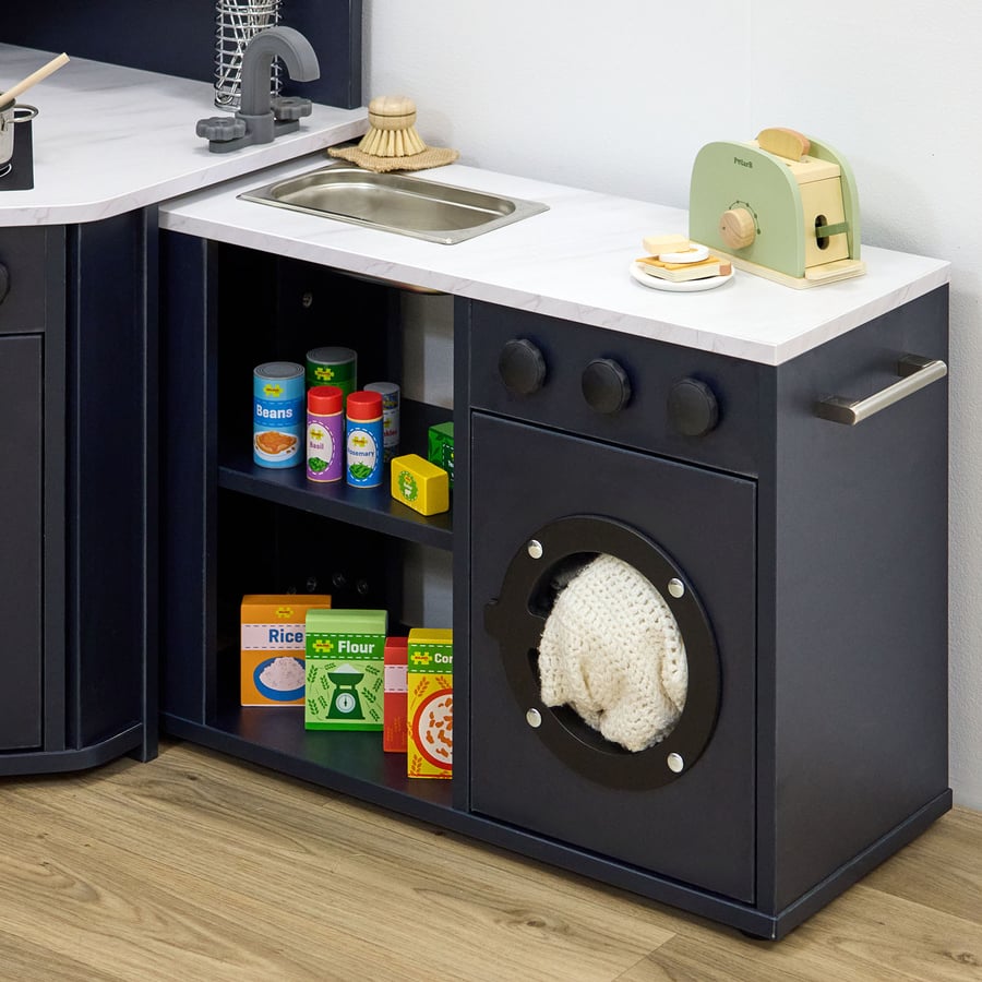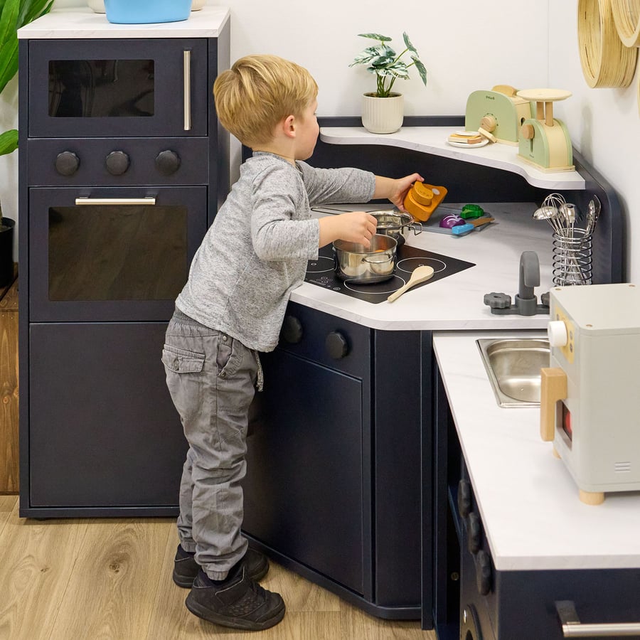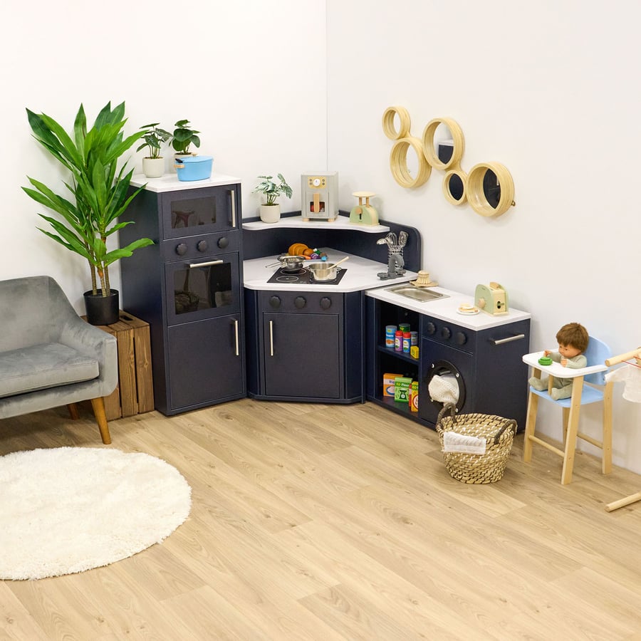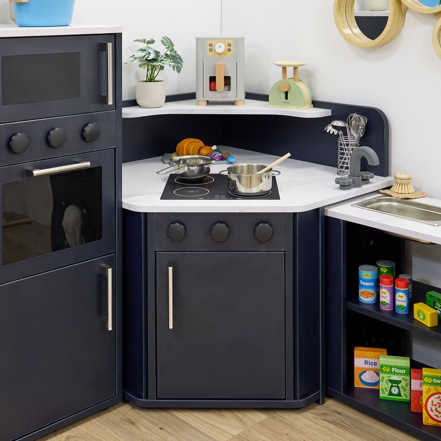 • The modern living corner kitchen helps to encourage social interaction, imaginative storytelling, and real-world role play. Designed to fit in a corner space, it invites children to work together, take on roles, and build confidence through meaningful play.