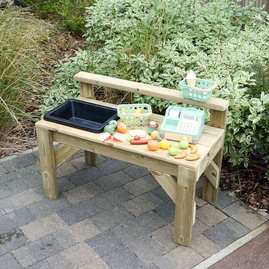 • A wooden messy play workbench with a built-in sink, open preparation area, and an upper shelf for storing bottles, tools, or resources, perfect for outdoor sensory play and role play.