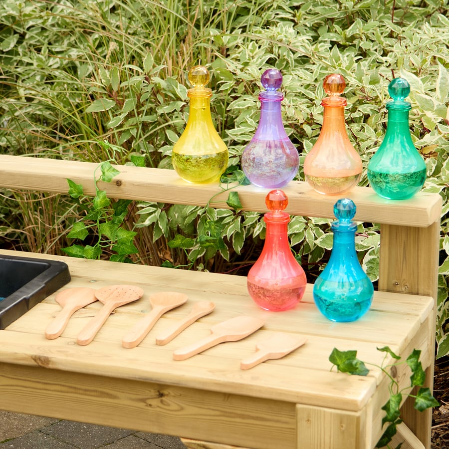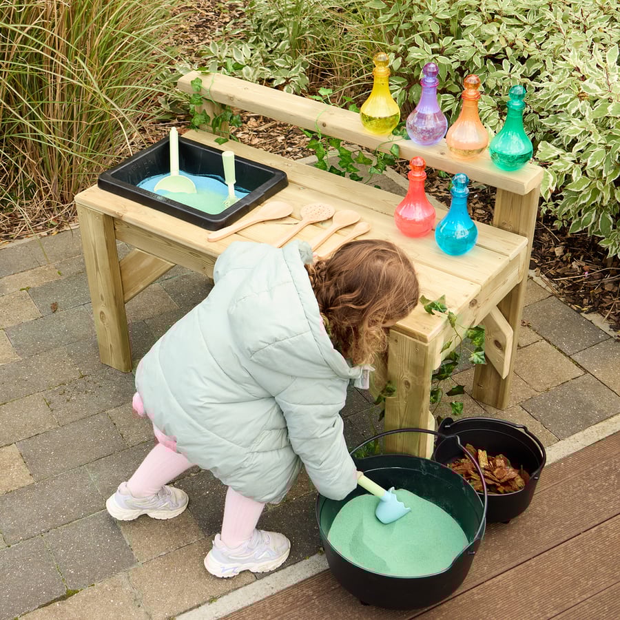 A versatile outdoor workbench for messy play, potion making, and creative exploration.