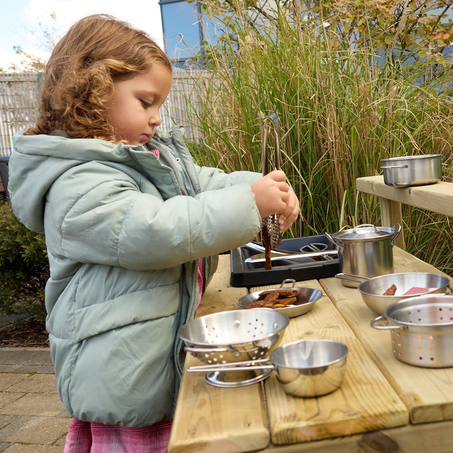 • The Outdoor Messy Play Workbench provides children with a dedicated space to prepare, mix, and create during sensory and imaginative play. Featuring a sink for pouring and water play, an open section for preparation, and a handy shelf above for storing potion bottles, tools, and resources, it supports both structured role play and open-ended exploration. Children can use the workbench to make potions, mix natural materials, or experiment with water and sand. As they scoop, pour, and combine, they develop fine motor control, coordination, and problem solving skills. The raised shelf encourages children to organise resources, promoting independence and a sense of ownership in their play. Built from durable wood and designed for outdoor environments, this workbench is a flexible and practical resource that enriches messy play, role play, and collaborative learning.
