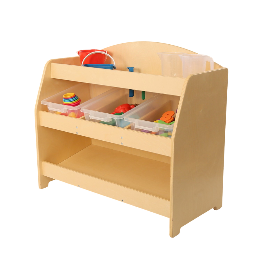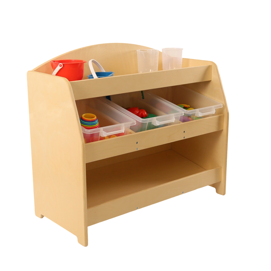 Versatile storage unit with angled shelves ideal for storing sand and water play accessories.