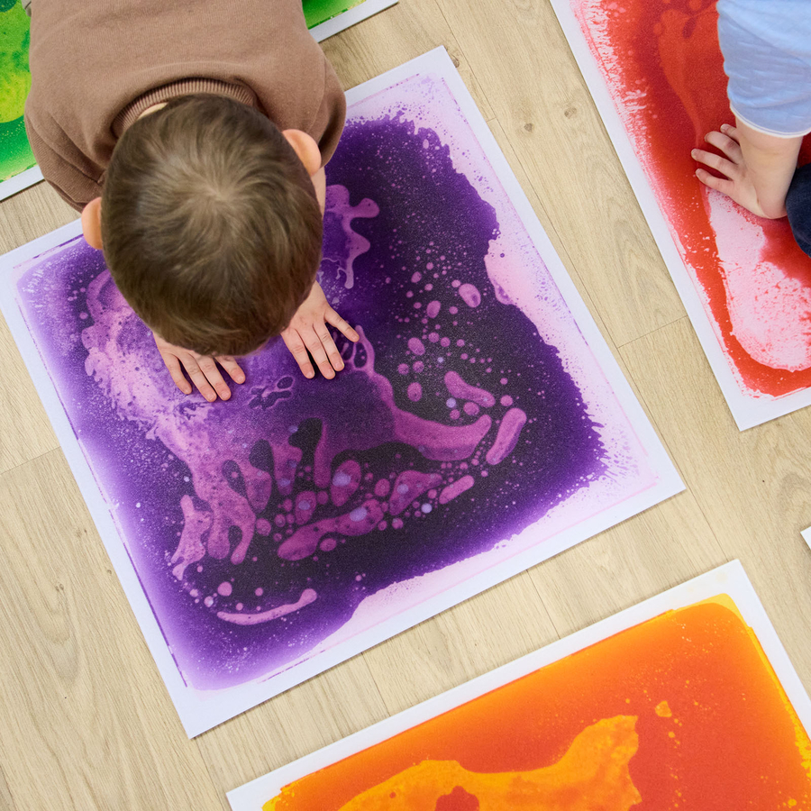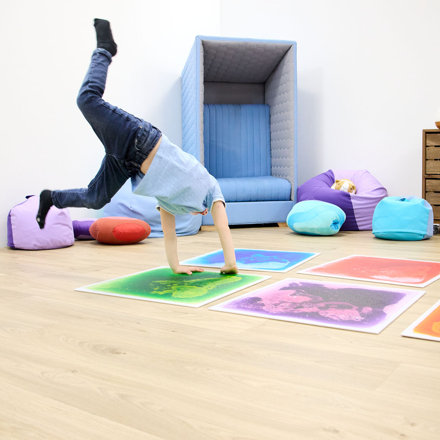 • Durable sensory floor tiles filled with colourful liquid gel that swirls under pressure, creating an ever-changing sensory surface.