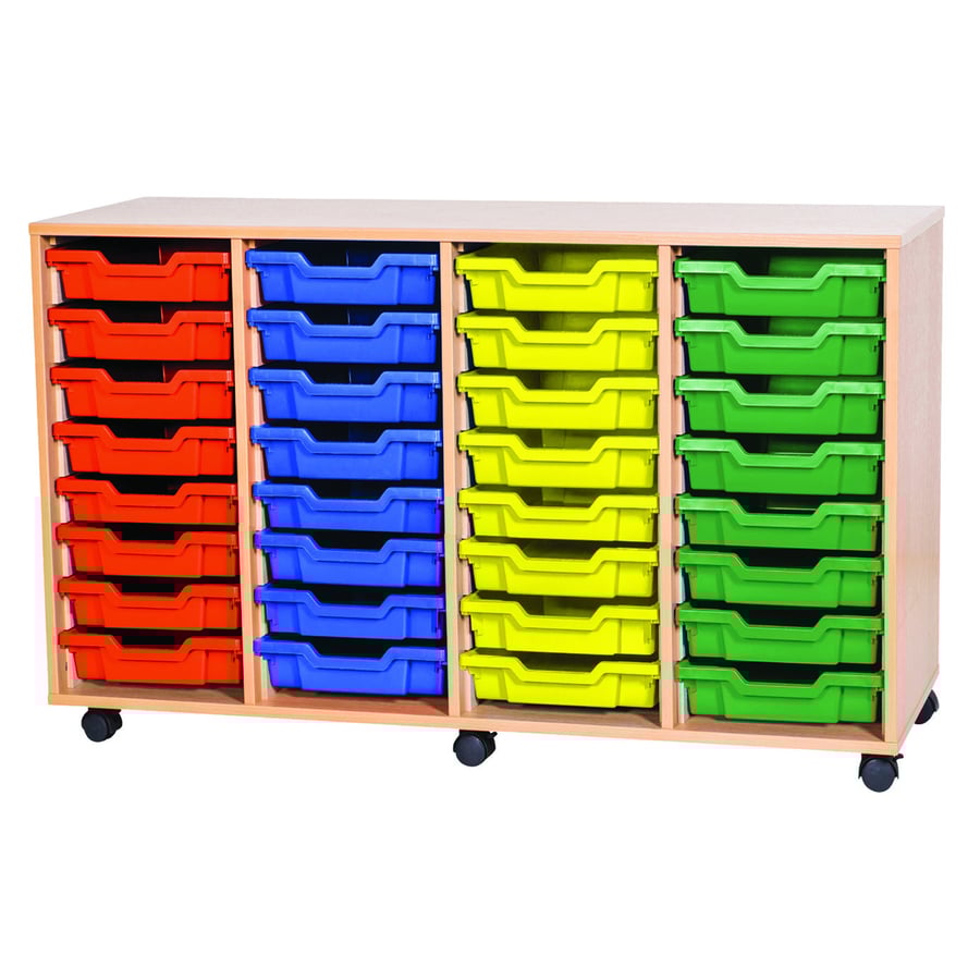 This storage unit includes 32 trays, with each column holding 8 shallow trays. It supports diverse storage needs and helps to maintain an organised classroom environment.