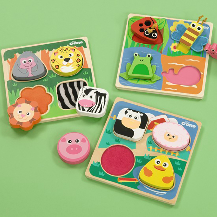 Explore different surfaces and textures with these wooden puzzles, ideal for early tactile learning.