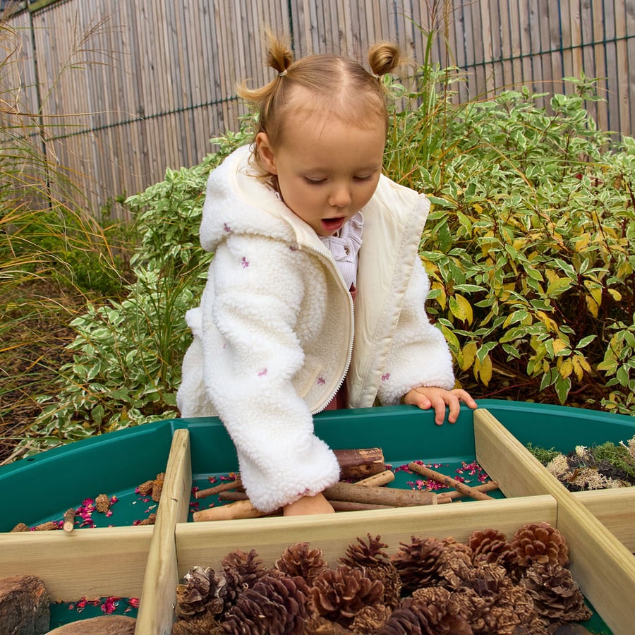 The dividers encourage the development of small motor skills. Activities such as pouring and threading become more structured, supporting children in developing their abilities.
