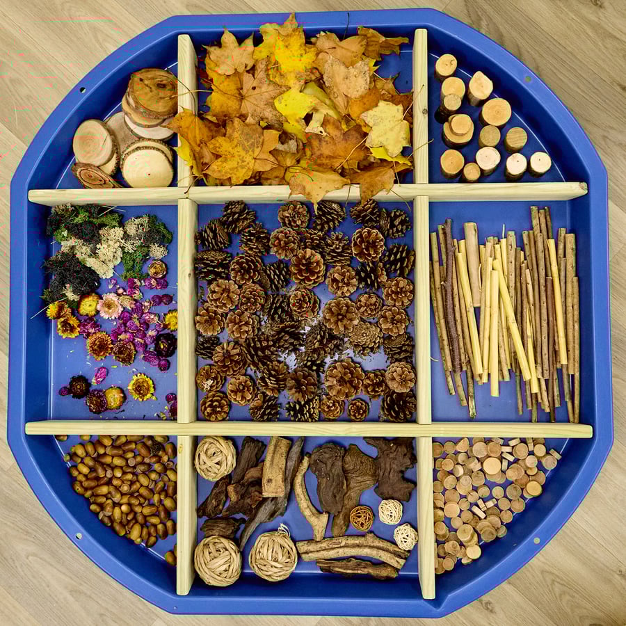 By dividing the tuff tray, children can explore multiple materials and concepts at once. This setup encourages curiosity and engagement with the natural world around them.
