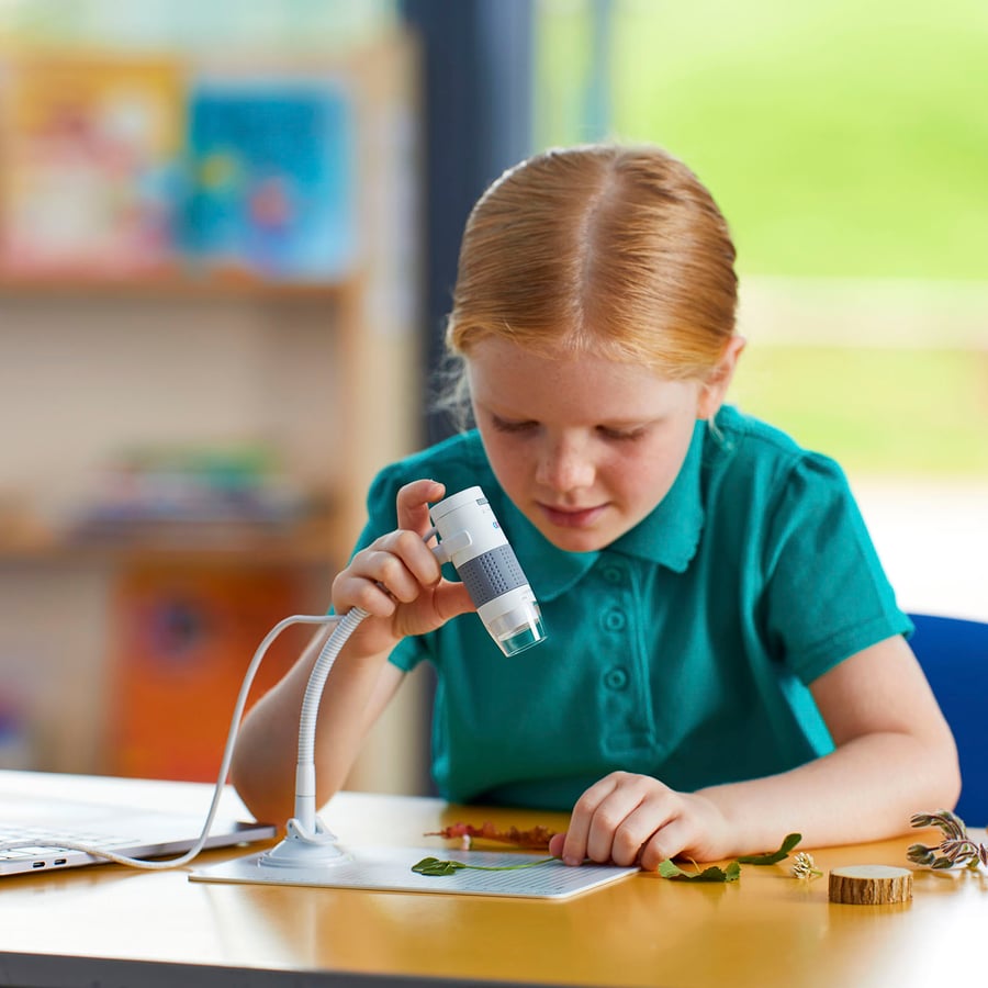 Designed for adaptability, this microscope is ideal for dynamic classroom environments, allowing for handheld use and easy magnification adjustments.