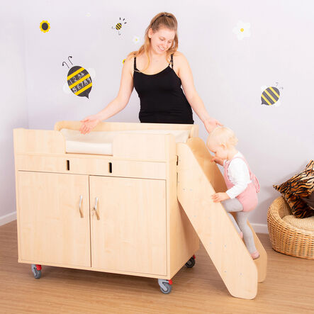 • Designed for toddlers' independent use, this changing unit comes with removable steps for easy access, reducing the need for staff to lift children. Configurable to various nursery spaces, the steps can be attached from different sides, adapting to specific room layouts.