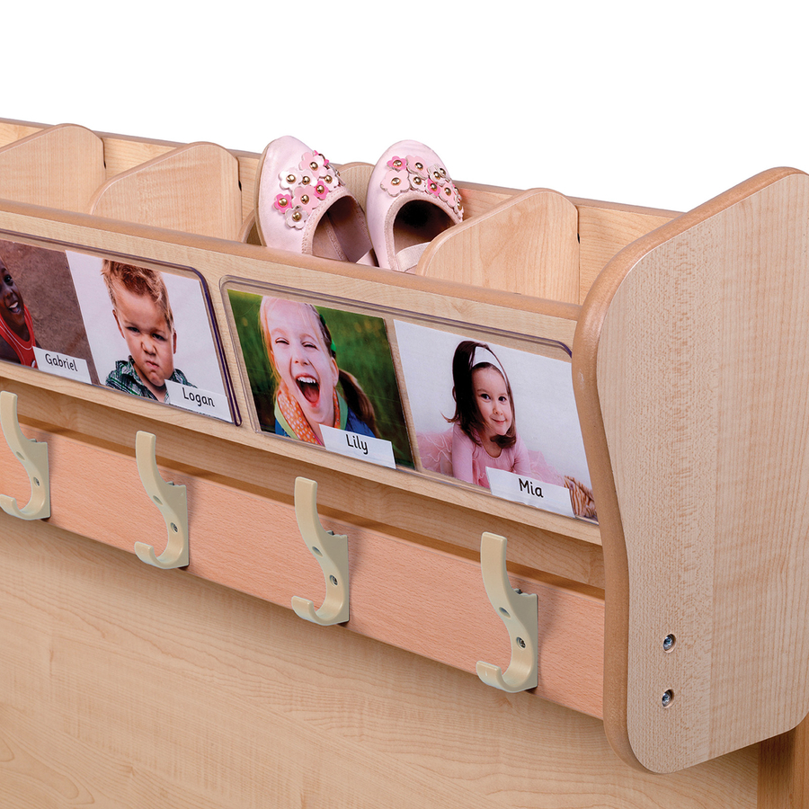 Managing children's belongings can be challenging. Six coat hooks with clear name pockets help children identify their items, while the bottom storage bench keeps bags and boots neatly stored.