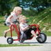 This tricycle is designed for two children, with one steering and the other pushing. It promotes teamwork and communication among children.